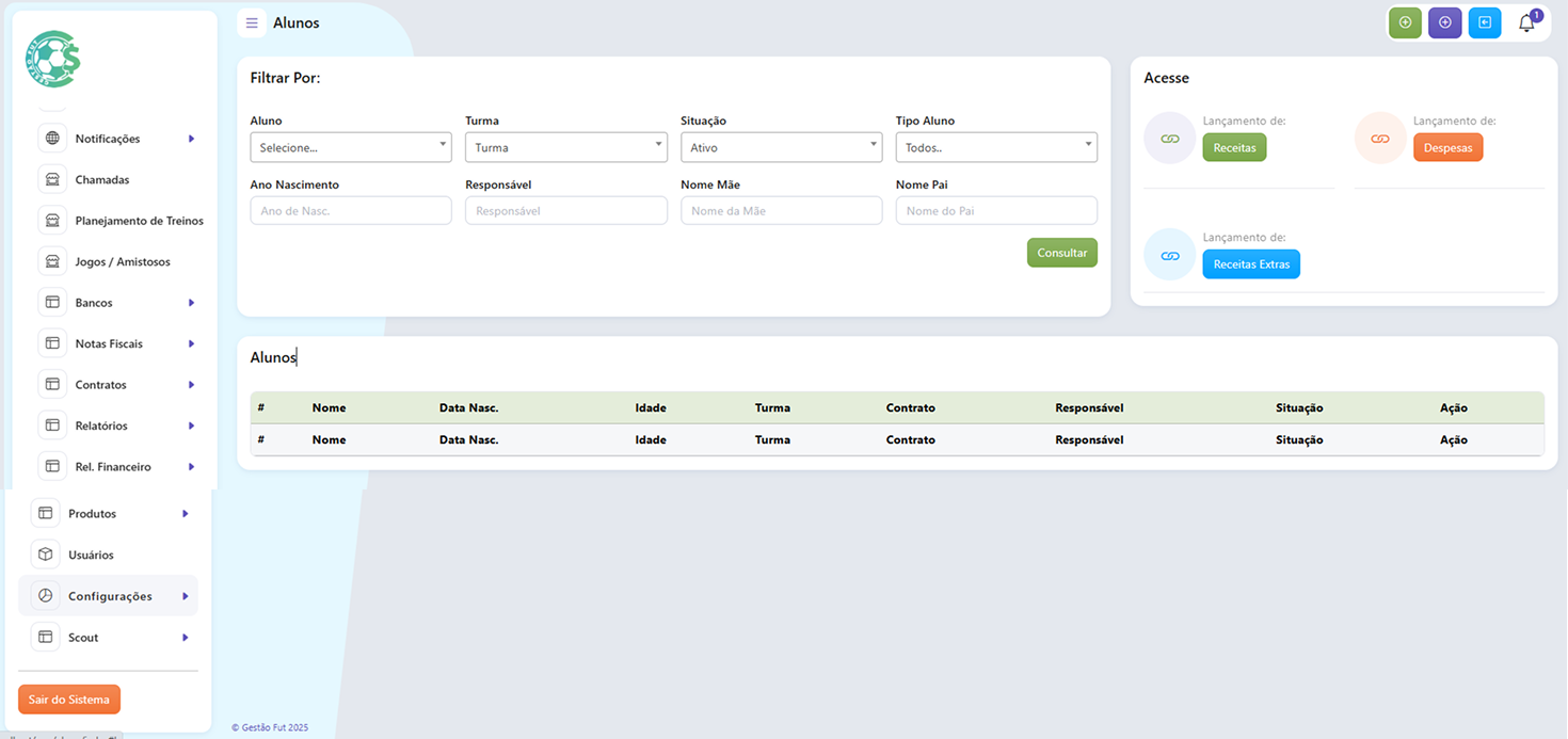 Gestão Fut nasceu para profissionalizar a gestão de escolinhas de futebol. Nossa plataforma reúne, em um só lugar, tudo o que você precisa para organizar alunos, pagamentos, presença e comunicação de forma simples e eficiente.