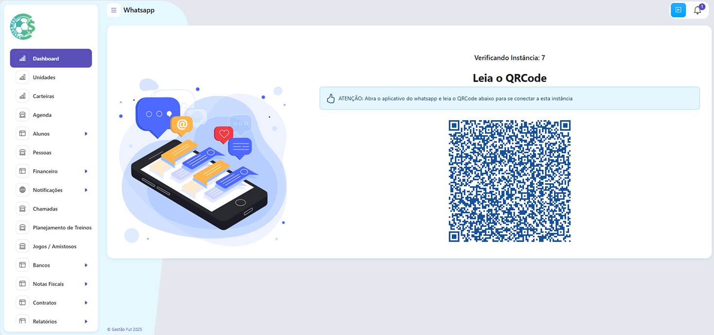 Notificações automáticas via WhatsApp para avisos, lembretes e pagamentos.